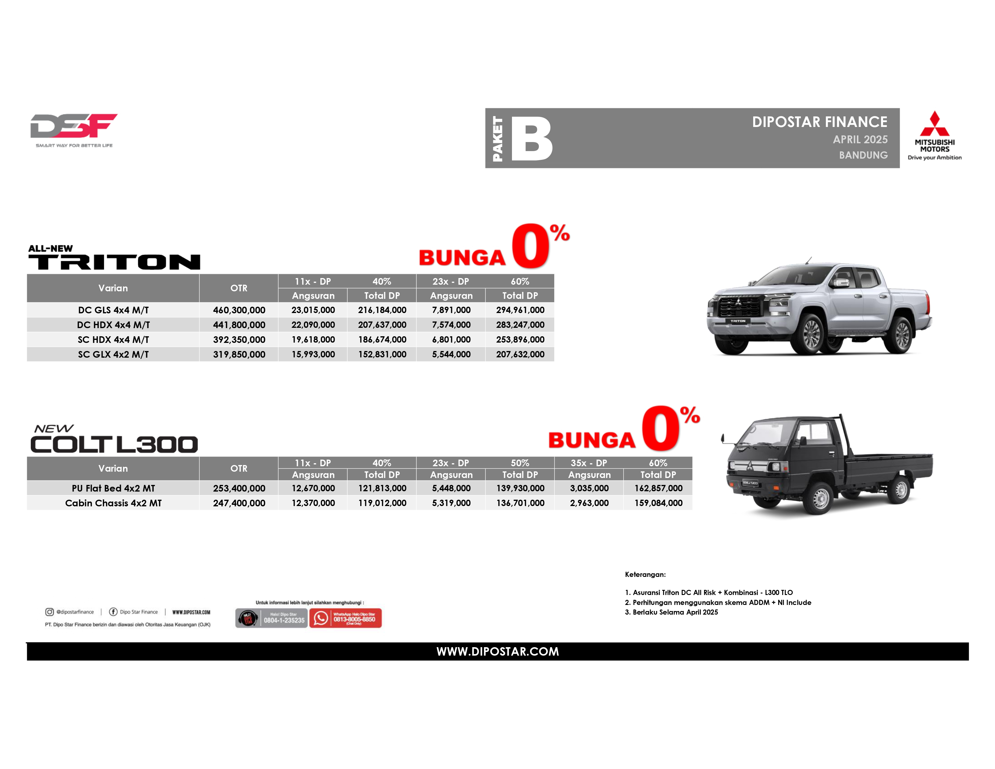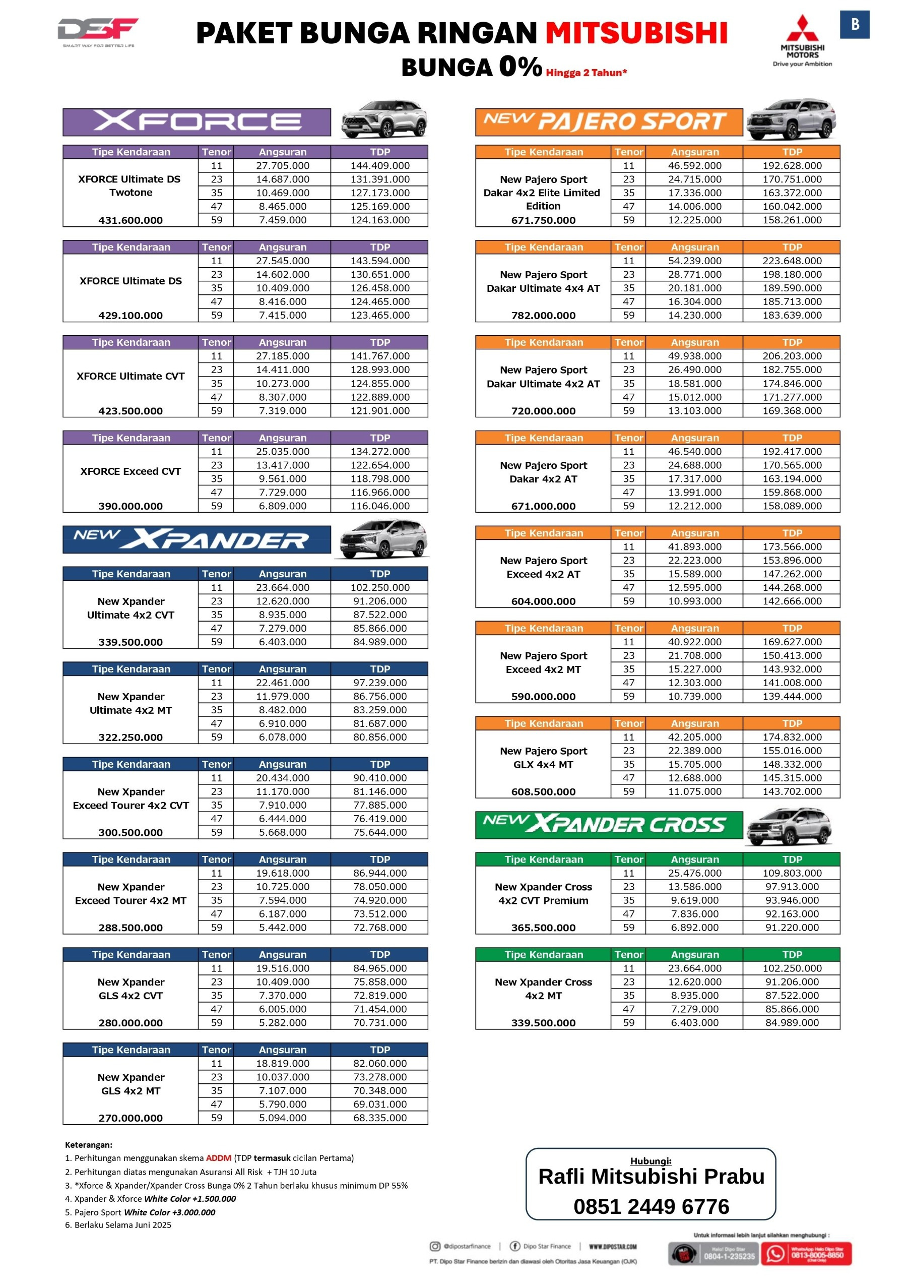 Berikut adalah pricelist lengkap dari harga Mitsubishi Xpander, harga Mitsubishi Xpander cross, harga Mitsubishi Pajero sport, harga Mitsubishi Triton, harga Mitsubishi Xforce, harga Mitsubishi Colt L300 Pickup, harga Mitsubishi Fuso.